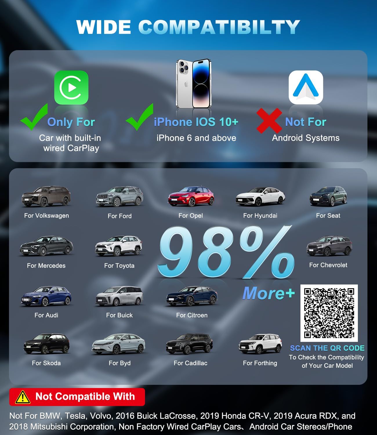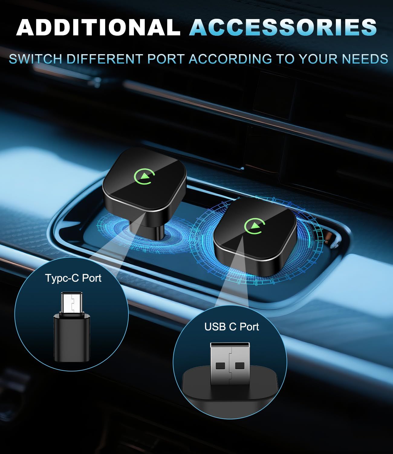 - يمكنه تحويل الاتصال الأصلي CarPlay / Android Auto السلكي إلى اتصال لاسلكي، مما يتيح لك التخلص من متاعب الكابل، دون الحاجة إلى فصل الهاتف وإعادة توصيله بشكل متكرر، مما يعني أن الهاتف الخاص بك لن يتآكل أكثر.